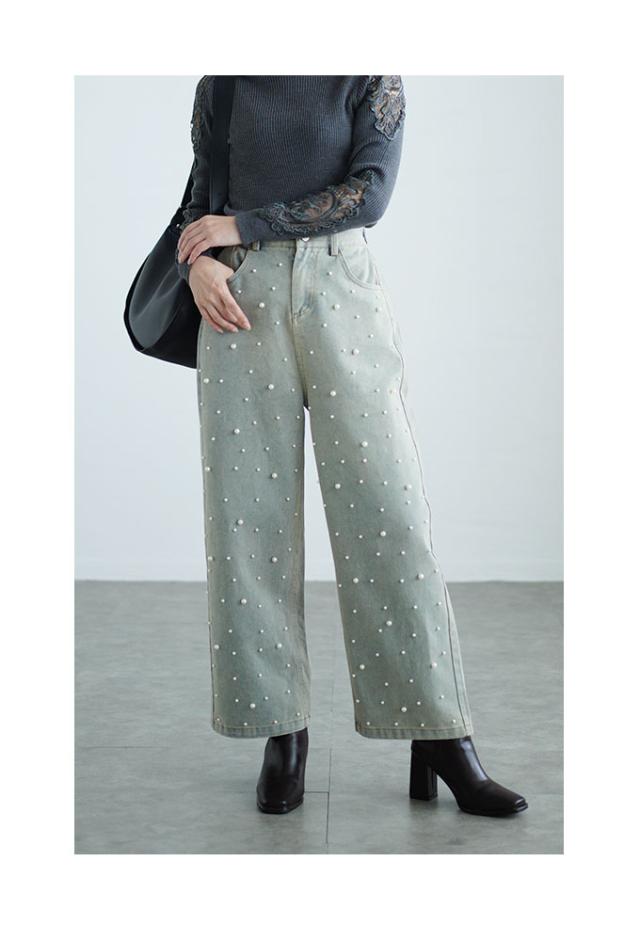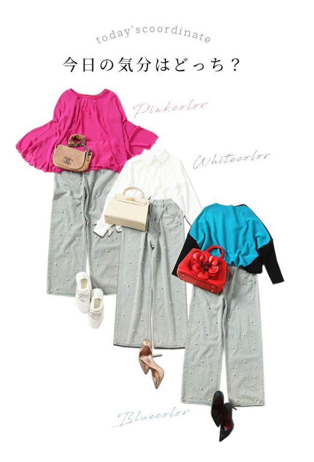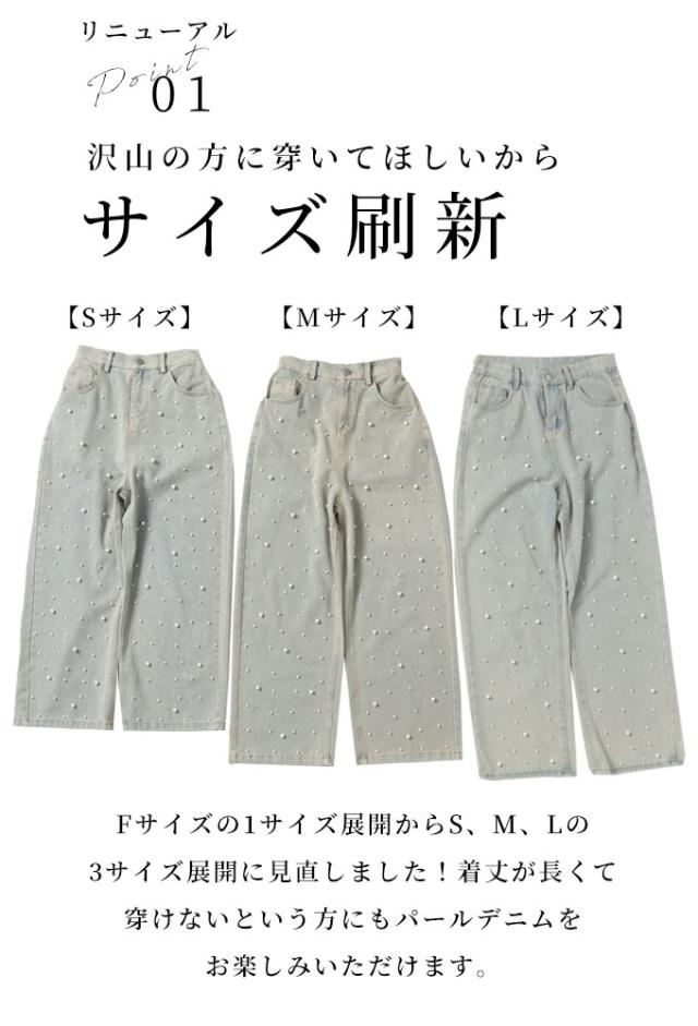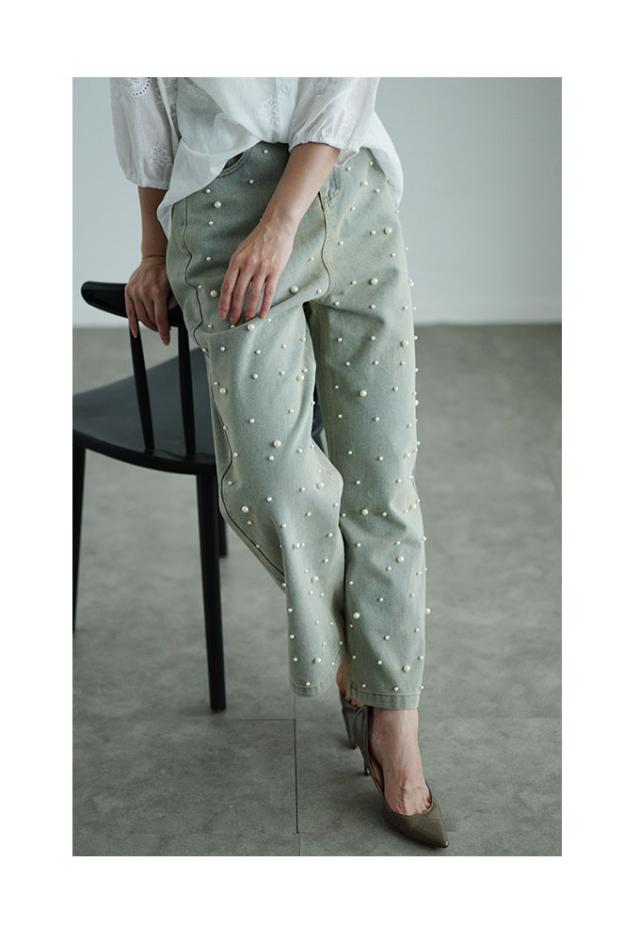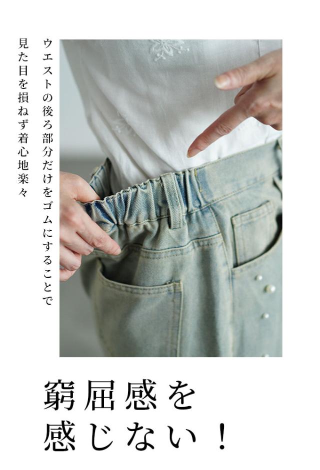冬新作 艶めくパールを散りばめたハイウエストデニムパンツ レディース ファッション ボトムス パンツ ライトブルー ロング丈 冬 大人可愛い S M L40代 レディースファッション 50代女性 ファッション 60代 ミセスファッション サワアラモード sawaalamode otona mode-9321