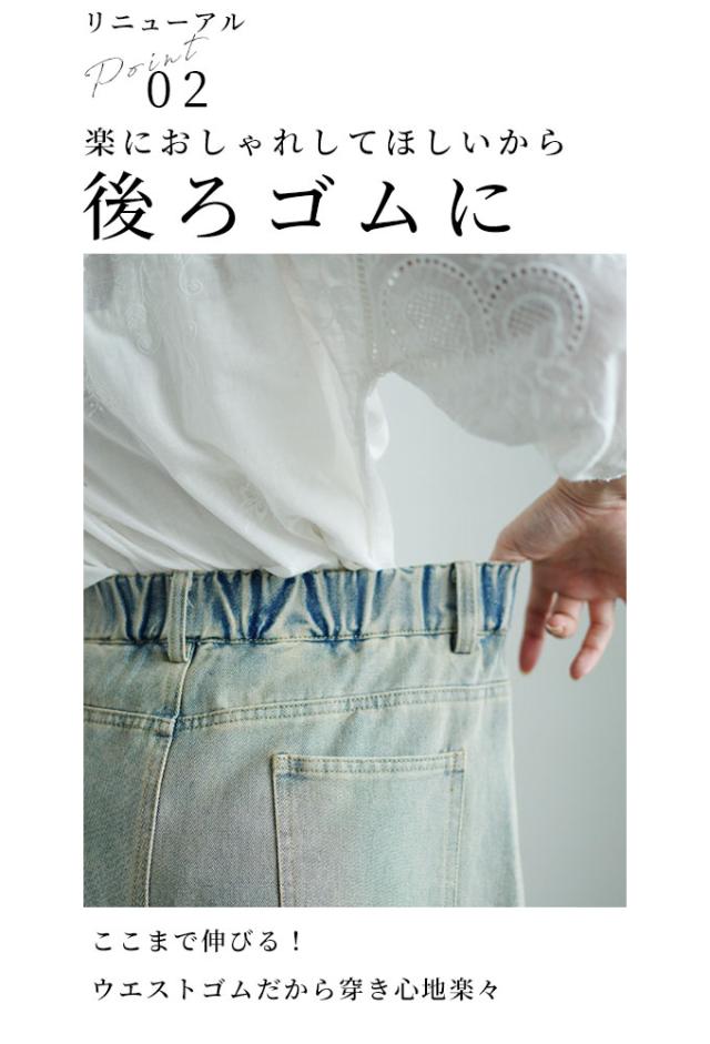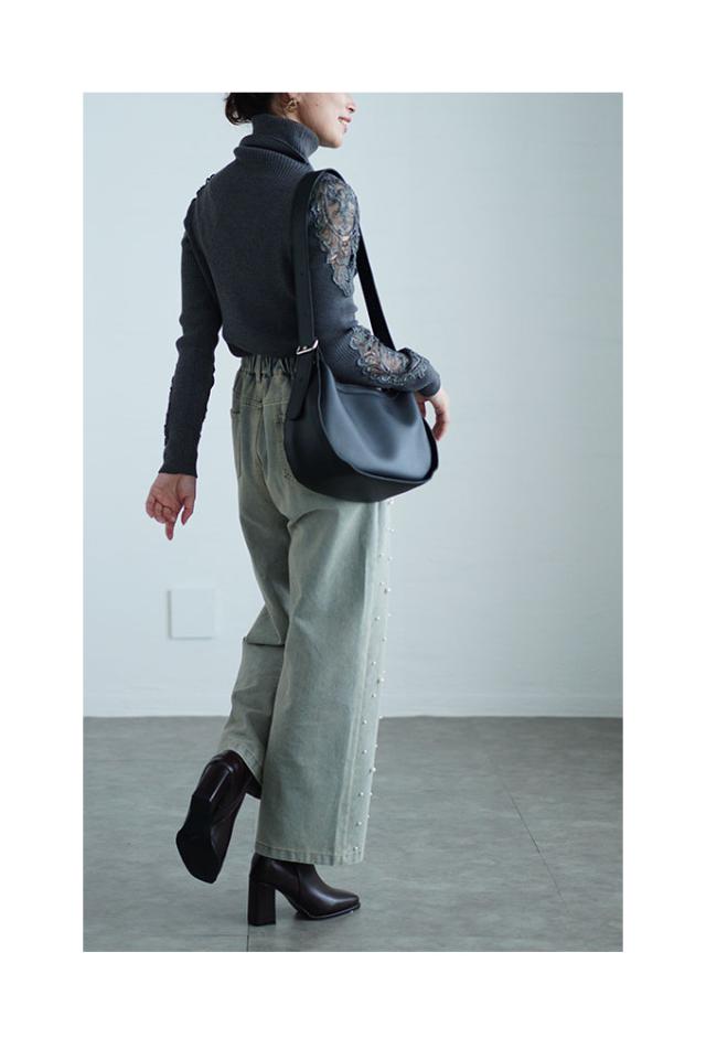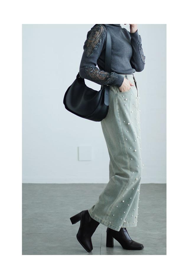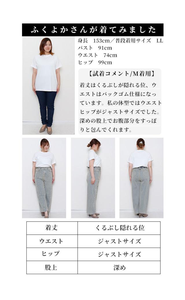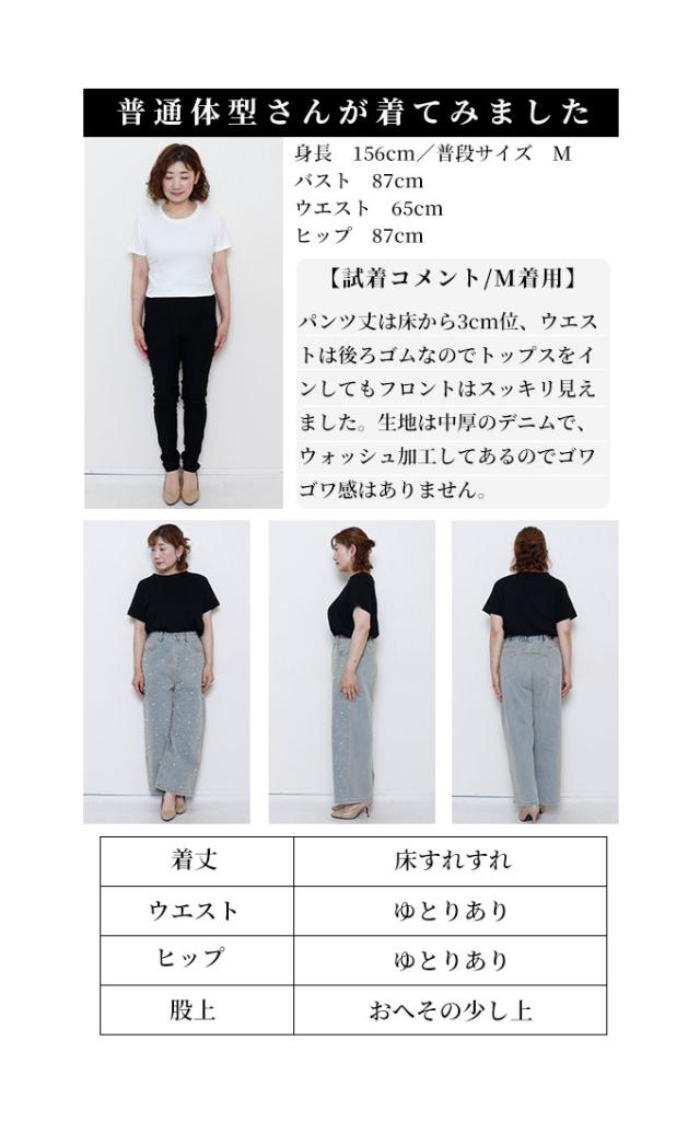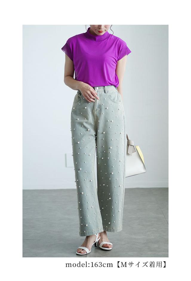 パンツ丈はとても長く、床についてしまいました。写真では8センチヒールを合わせています。洗いをかけたこなれ感のあるデニムで、ストレッチは効きませんがワイドシルエットなので脚のラインを拾わず、しゃがんでも楽でした。股上は胃のすぐ下まであり深めです。ウエストはややゆとりがありました。前面に大小のパールがあしらわれ、抜け感のあるオシャレなカジュアルスタイルが楽しめます。