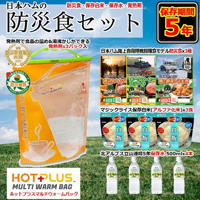 日本ハムの防災食セット ご飯 おかず お水 発熱剤入 5年保存 非常食 長期保存 HOTPLUS 3食分 陸上自衛隊戦闘糧食モデル防災食 ホットプラスマルチウォームバッグ