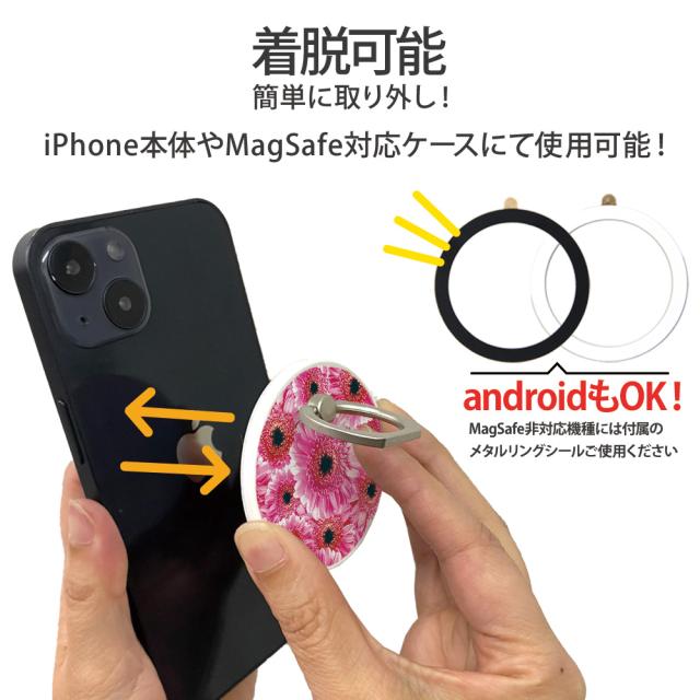 スマホリング MagSafe対応 メタルリング 落下防止 片手操作 180度 360度 回転 マグセーフ magsafe 携帯 リング ホルダー スマートフォン 指 かけ 薄型 マグネット 磁石 フィンガーリング iPhone15リング ダリア ヒナギク バラ クロッカス アオマクラ ピンクローズ ガーベラ 春の花 ピンクガーベラ お洒落 大人かわいい シンプル 花柄 フラワー シンプル 女性