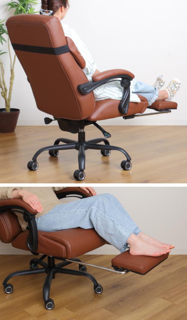 フットレストをスライド式に引き出し、疲れた脚を預けてリラックス。背もたれを完全に倒すと全身の力が抜けて心地よいリラクゼーションに。使わない時は座面下に収納できます。