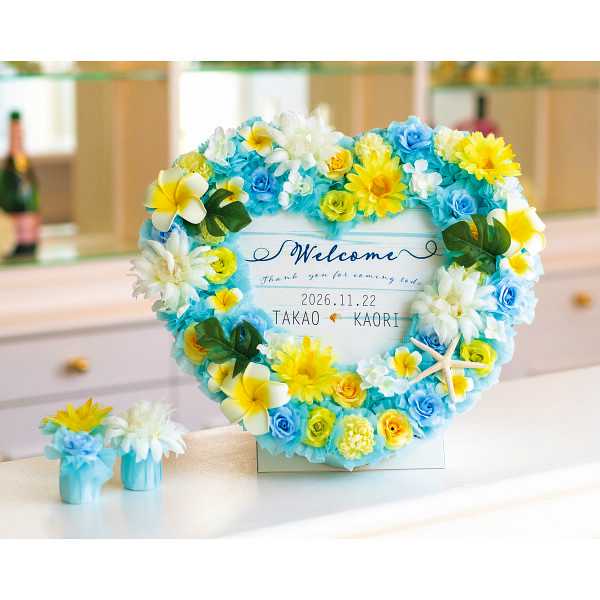 プルメリアはハワイで「幸せに導く守り神」とされる花。ハートのリースでお二人の門出を祝福します。