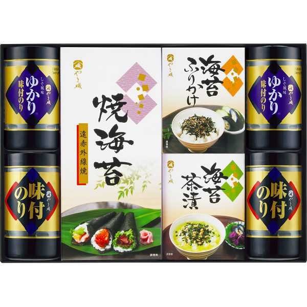 口どけのよい海苔に有機丸大豆醤油使用のたれで調味した味付海苔、三島食品の「ゆかり」を使用したたれで調味した赤しそ風味の味付海苔、遠赤外線でパリッと焼き上げた風味豊かな焼海苔、味付海苔と香ばしいごまの風味がおいしい海苔ふりかけ、焼海苔にごまやあられをブレンドした後味さわやかなお茶漬けをセットしたバラエティギフトです。