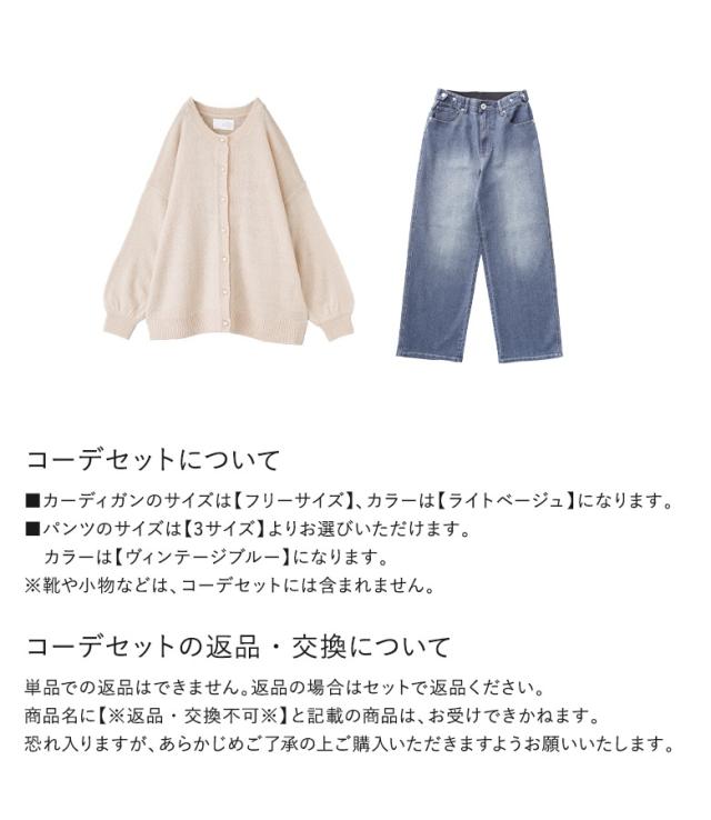 ベージュ ライトベージュ ブルー 青 ヴィンテージブルー 202402 2点セット レディース ボトムス パンツ デニム ロングデニム ジーンズ ダメージ クラッシュ ボーイズデニム イージーデニム ストレートデニム ワイドデニム イージーパンツ ストレートパンツ 美脚効果 脚長効果 ロング丈 マキシ丈 フルレングス 10分丈 ウエストゴム 無地 おうちで洗える 春夏秋冬 オールシーズン オフィス カジュアル 通勤 通学 お買い物 お出掛け 旅行 大人可愛い お洒落可愛い ヴィンテージ クラシック モード シンプル ナチュラル ニュアンス ラフ Mサイズ Lサイズ LLサイズ ぽっちゃり 体型カバー 大きいサイズ ニットカーディガン 秋冬 トップス セーター 長袖 モヘヤタッチ フェイクパール ニット ショートカーディガン クルーネック ぽわん袖 ドロップショルダー イミテーションパール パール調 レイヤード 重ね着 秋 冬 キレカジ フェミニン Sサイズ 3Lサイズ XLサイズ フリーサイズ 福袋 コーディネートセット コーデセット 中身が見える福袋 上下セット[ID]19cl3ag