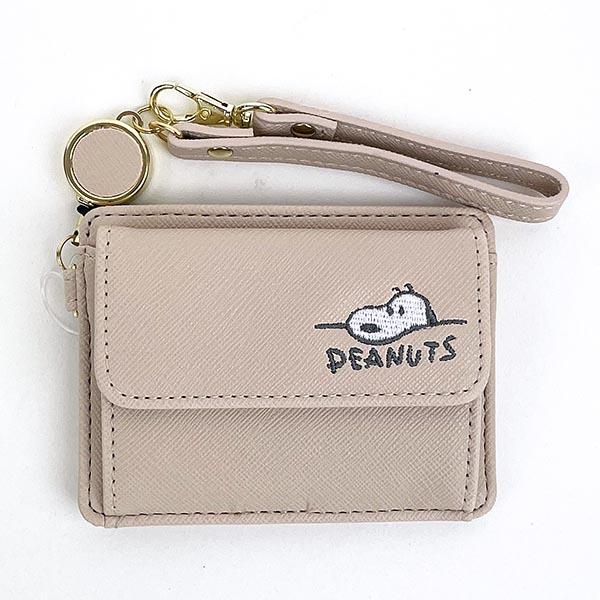 スヌーピー パス&コインケース ピンクベージュ デスク刺繍 リール付き ICカードケース 定期入れ
