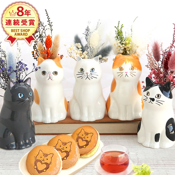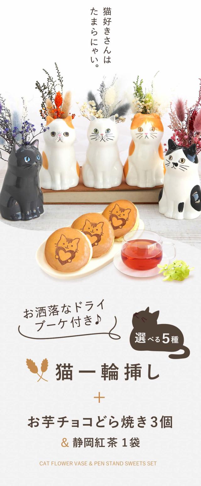 | 商品名 | ドライブーケ付き猫一輪挿し陶器+ネコ柄お芋チョコどら焼き3個セット |