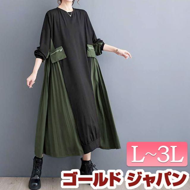 大きいサイズレディース ワンピース サイドプリーツロングワンピース ワンピ ロングワンピース サイドプリーツ プリーツ プリーツワンピース クルーネック 長袖 切替 ポケット フレア バイカラー 無地 韓国 春新作 春服 秋服 F フリー LL 2L 3L ブラック ゴールドジャパン