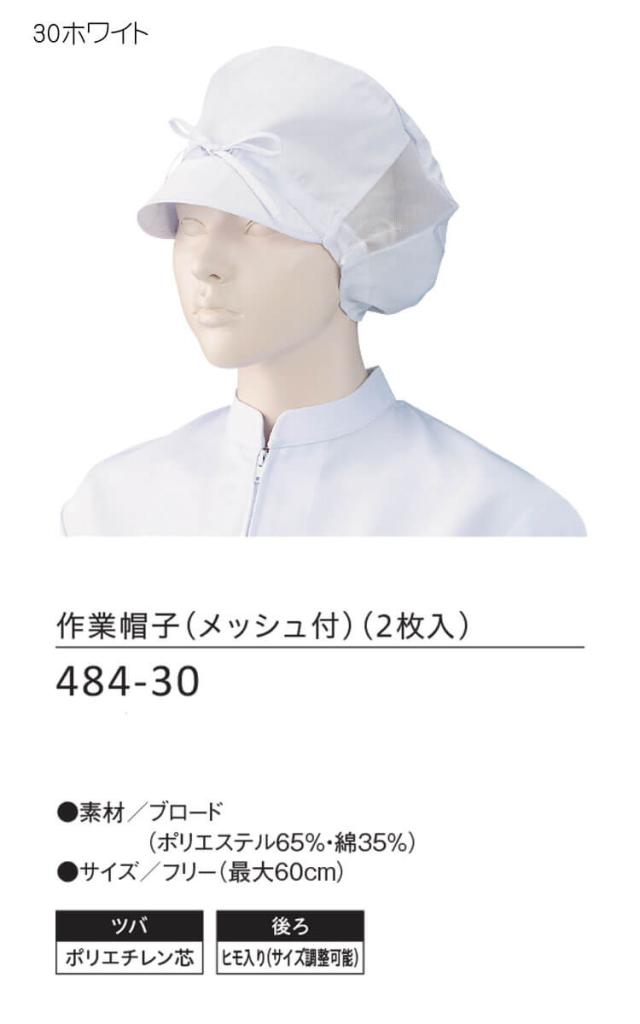 食品工場白衣 作業帽子 メッシュ付 484-30 2枚入 女性用 カゼン KAZEN フードファクトリー 衛生帽子 制服 ユニフォーム