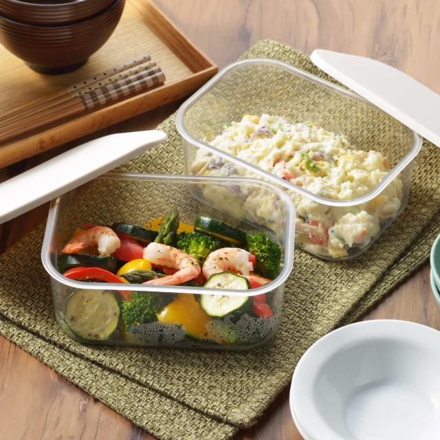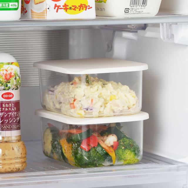 複数個を合わせて使ってもガラスのように透明度が高いので中に入れた物が一目瞭然で分かりやすい保存容器です。冷蔵庫の中で重ねて使用してもデッドスペースが生まれにくくスッキリと収まるスクエア型です。
