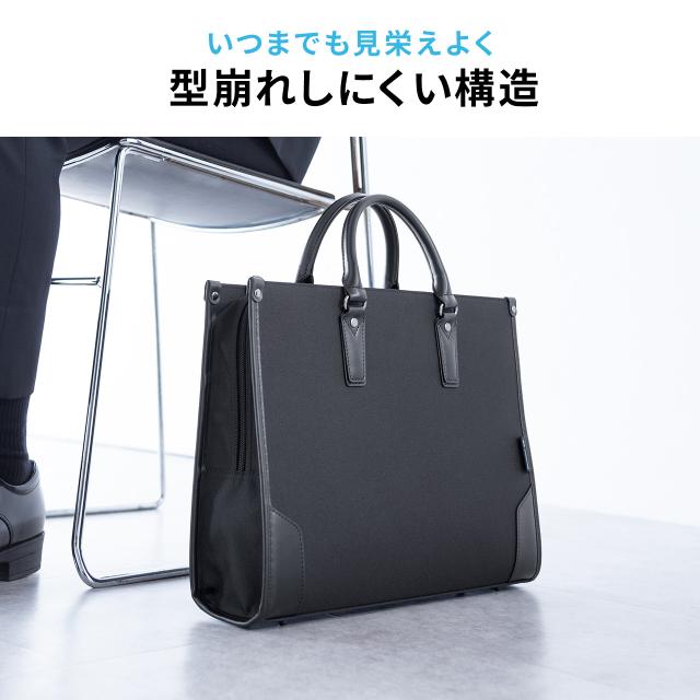 ⇒ご購入の前にご確認下さい学生の就職活動、インターン、入学式、毎日の通勤用として最適な、シンプルデザインのビジネスバッグ。ショルダーベルト付きで肩掛け使用もできる。A4書類や14型ワイドノートPCを収納できるサイズ。撥水加工。ブラック。【WEB限定商品】