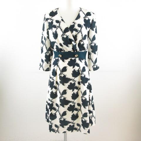【中古】La MODE ワンピース ひざ丈 七分袖 花柄 オフホワイト 白 緑 S *T204 レディース