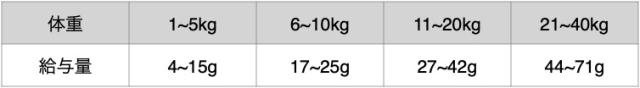 ・上記の給与量を目安に愛犬の大きさ、健康状態、年齢、運動量などを考慮して1日2回から3回に分けてお与えください。