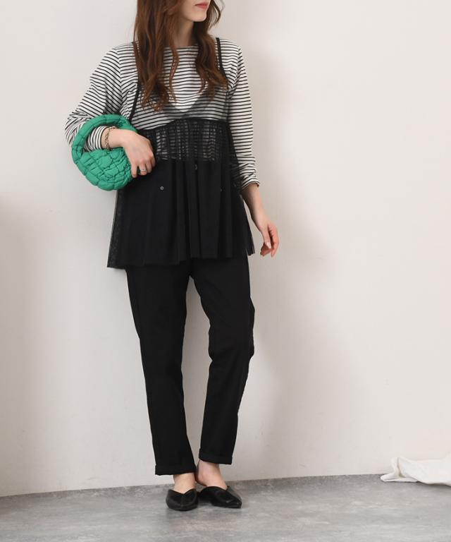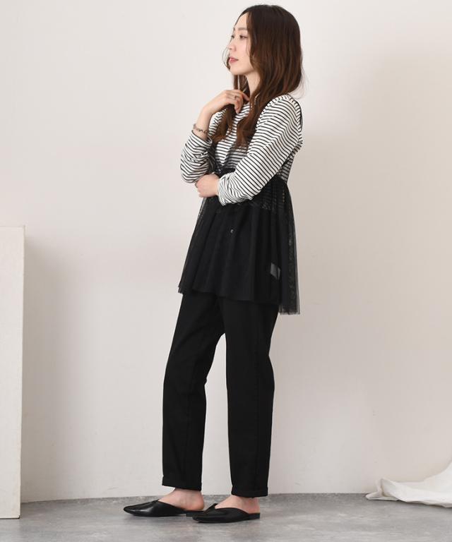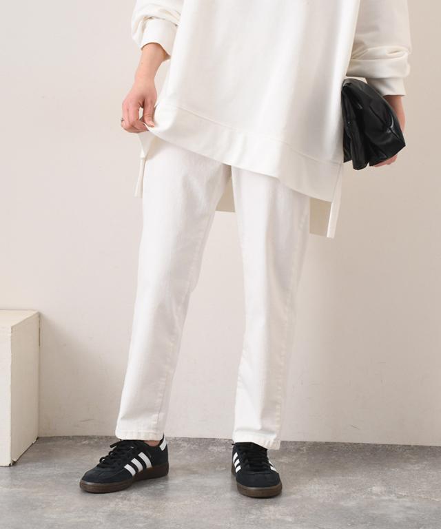 バックウエストゴム仕様でinコーデもスッキリ決まる