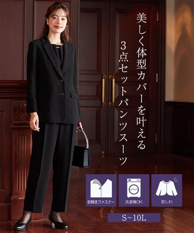 喪服 礼服 ブラックフォーマル パンツスーツ レディース 洗える防しわ フォーマル 3点セット スーツ ロング丈 テーラード ジャケット +パール調 アクセサリー 付 前開き ブラウス + パンツ 有 冠婚葬祭 フォーマルスーツ 黒 S/M/L ニッセン nissen