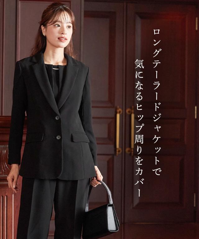 ロング丈ジャケットで綺麗に体型をカバー!上品で気品のある雰囲気のフォーマル3点セットスーツ