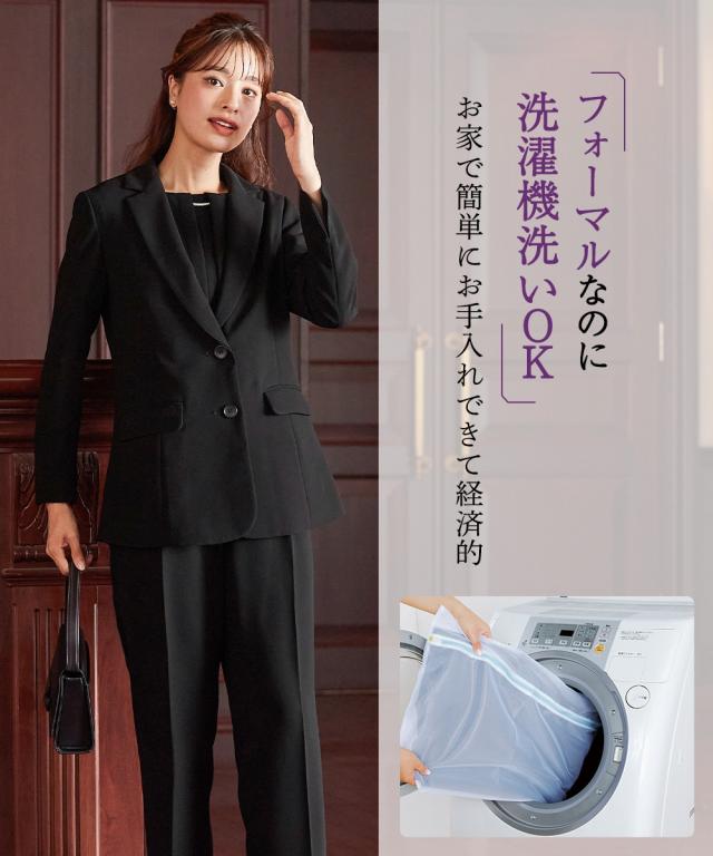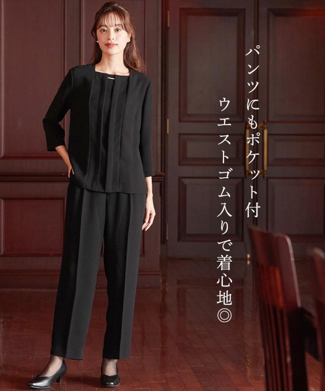 【喪服・礼服】洗える防しわフォーマル3点セットスーツ(ロング丈テーラードジャケット+パール調アクセサリー付前開きブラウス+パンツ)