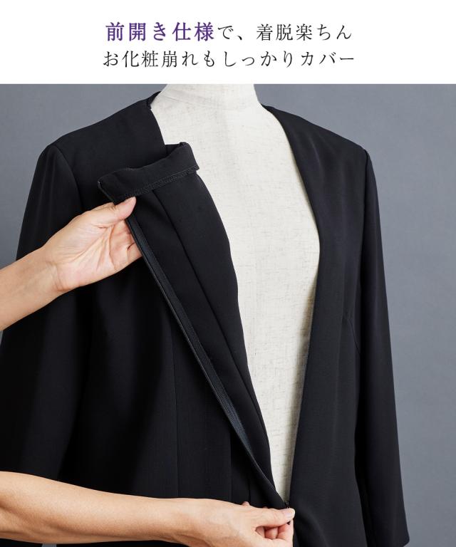 【喪服・礼服】洗える防しわフォーマル3点セットスーツ(ロング丈テーラードジャケット+パール調アクセサリー付前開きブラウス+パンツ)