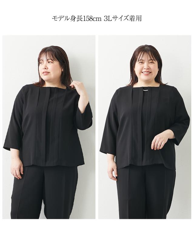 喪服 礼服 ブラックフォーマル パンツスーツ 大きいサイズ レディース 洗える防しわ フォーマル 3点セット スーツ ロング丈 テーラード ジャケット +パール調 アクセサリー 付 前開き ブラウス + パンツ 有 冠婚葬祭 フォーマルスーツ 黒 4L/5L/6L ニッセン nissen