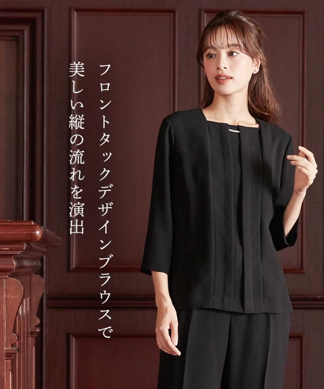 【喪服・礼服】洗える防しわフォーマル3点セットスーツ(ロング丈テーラードジャケット+パール調アクセサリー付前開きブラウス+パンツ)