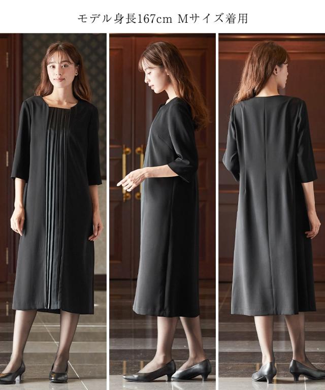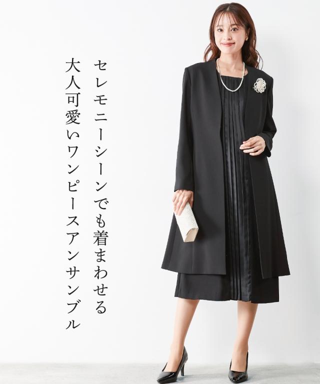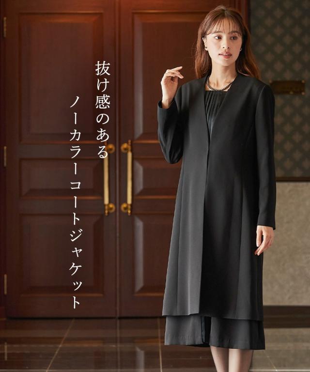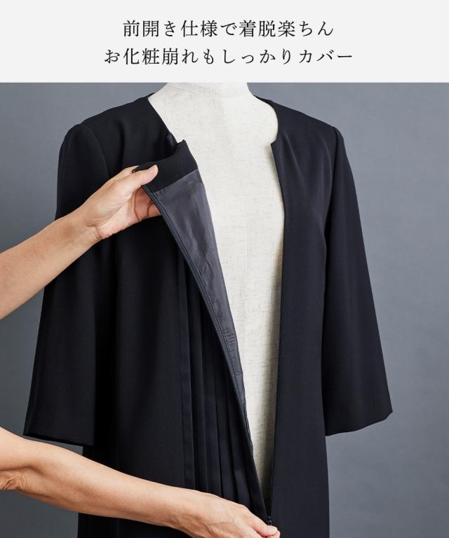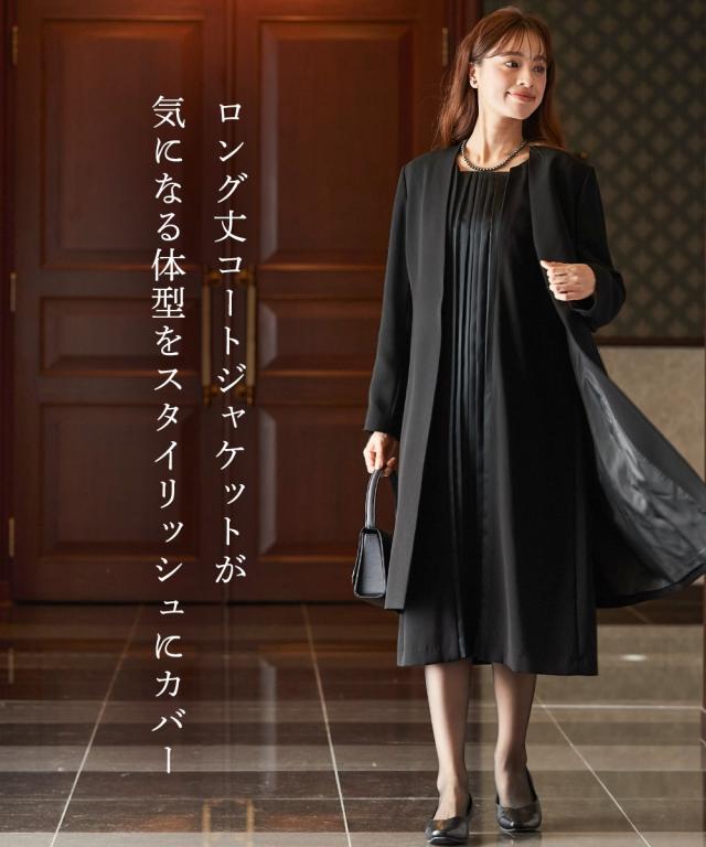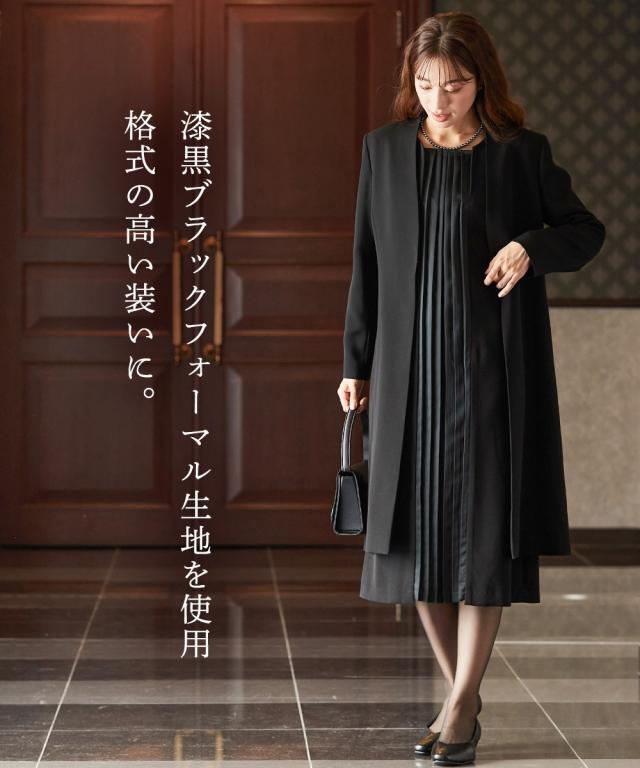 喪服 礼服 ブラックフォーマル ワンピース レディース 防しわ ロング コート ジャケット ストレッチ アンサンブル ノーカラー +フロント プリーツ 前開き 有 冠婚葬祭 フォーマルワンピース 黒 S/M/L ニッセン nissen