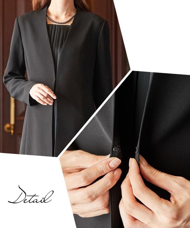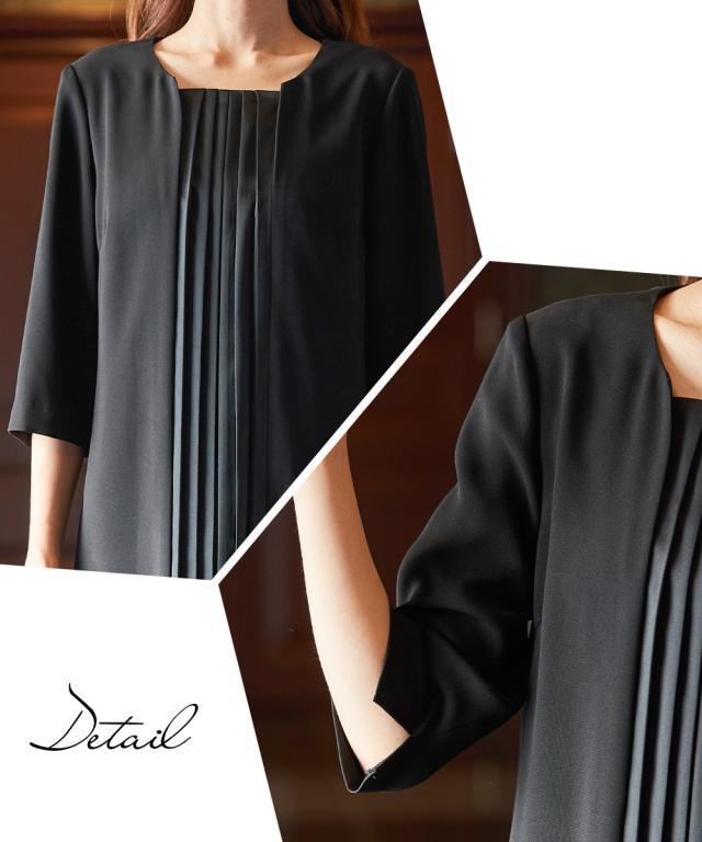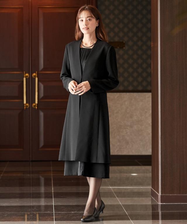 【喪服・礼服】防しわロングコートジャケットワンピースストレッチアンサンブル(ノーカラーロングコートジャケット+フロントプリーツ前開きワンピース)