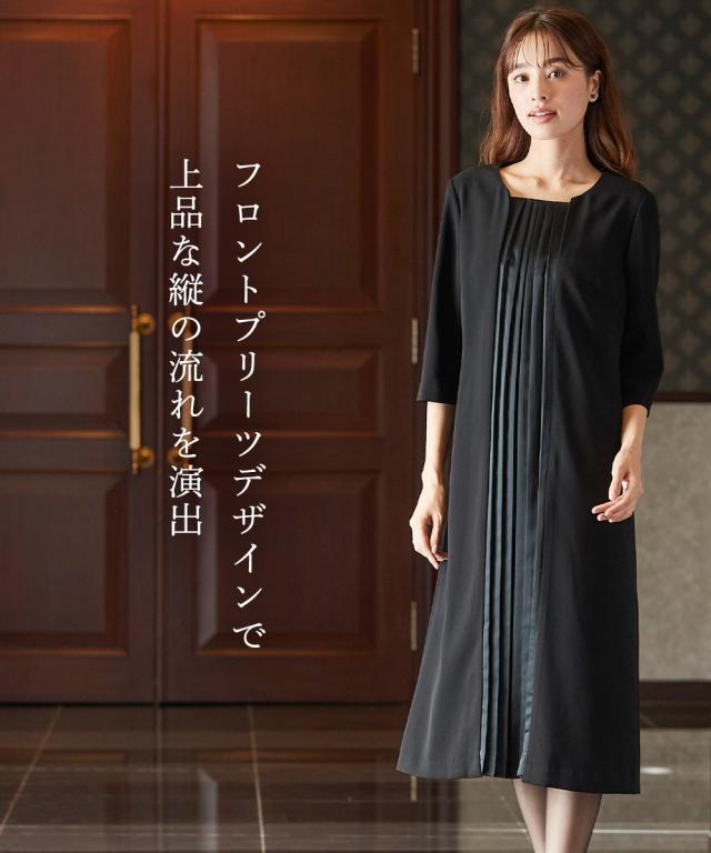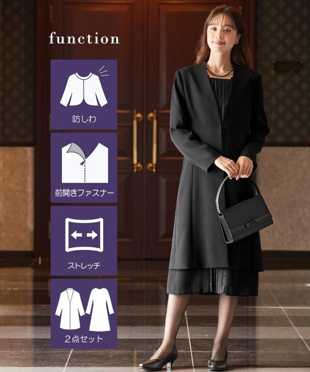 【喪服・礼服】防しわロングコートジャケットワンピースストレッチアンサンブル(ノーカラーロングコートジャケット+フロントプリーツ前開きワンピース)