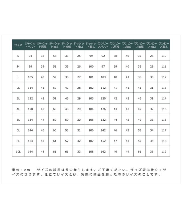 品質=[表地]ポリエステル100%(織物) [裏地]有(ジャケット:総裏 ワンピース:身頃部) ジャケット:肩パッド有(取外し不可) 前ホック開 ポケット両脇スラッシュポケット ワンピース:前ファスナー開 ポケット無 袖口スリット ※この商品は2点同サイズのみで販売します。 ※ジャケットはLLサイズから五面体仕様です。 原産国:中国製(企画デザインは日本) 洗濯表示:ジャケット:洗濯機OK ネット使用 ワンピース:手洗い