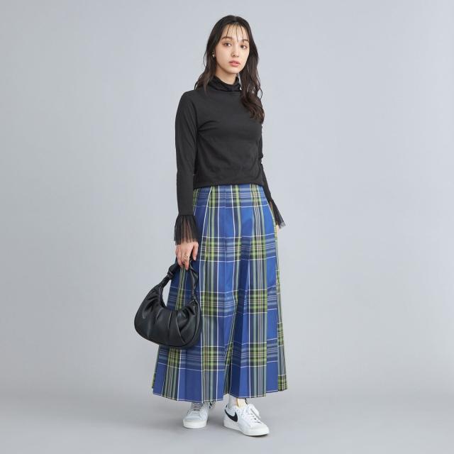 端正なプリーツと広がり過ぎないシルエットが、より上品な印象を強めています。