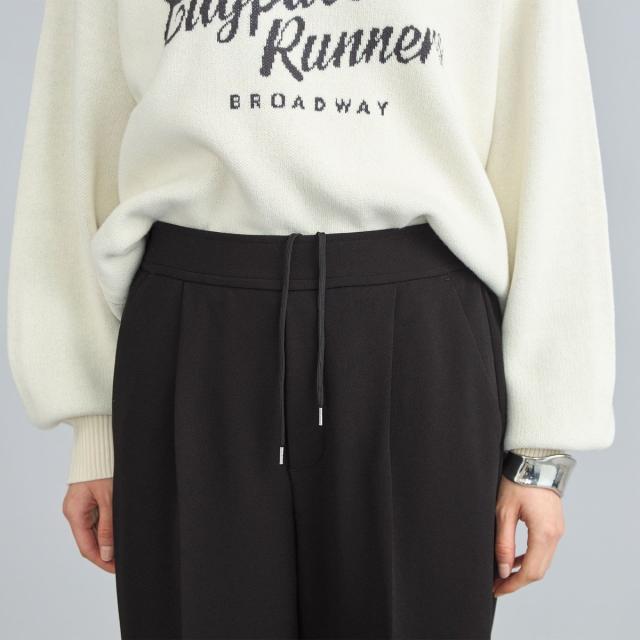 センタープレスと高めの位置のヒップポケットでシャープに見せつつ、ウエストはリラックスできる穿き心地のドローコード仕様。フィット感の調節もスムーズに可能です。