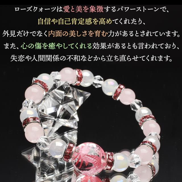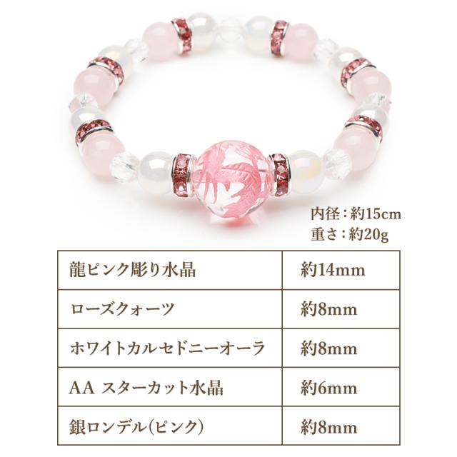 | 特徴・意味 | 本水晶に華やかなピンク色の龍神が彫刻されており、人気のマダガスカル産ローズクォーツと組み合わせることで、より華やかで女性でも身につけやすい、可愛らしい印象のブレスレットに仕上げました。 同シリーズの品番「A1265」「A1267」と色違いでのご購入もおすすめです。 プレゼントやお守りとしてぜひご検討ください! 【龍彫刻の意味・効果】 龍は吉祥の象徴で、強運・金運・勝負運・成功などの運気を上げる力を持つと言われています。 また、厄除け・邪気祓いの効果も持っているので、厄年の方にもオススメなアイテムです。 彫刻された龍は五本爪で、本来皇帝だけに使用することを許されていた特別な権威を持つ「最高品格の龍」です。 また、五爪龍は男龍であると言い伝えられており 強さや威厳などの象徴でもあります。 【水晶(クリスタルクォーツ)】 水晶は、すべてのものを浄化し、マイナスなエネルギーを取り払い、余分なものを排除してクリアな状態にしてくれる万能ストーンです。 また、潜在能力を引き出し、直感力、創造力を育み、生命力をアップしてくれるでしょう。 水晶には、雑念を取り去り、集中力を高める効果があるとされています。 【ローズクォーツ】 10月の誕生石でもあるローズクォーツは、女性にとっては嬉しい「自己愛・恋愛成就」という石言葉を持ち、「愛と美の石」を代表する美しい石です。 持つ人をやわらかい波動で包み込み、感情の荒波を鎮めて、深い内面的な愛を引き出すと言われています。 材質 ▼ 青龍水晶ピンク彫り:14mm ホワイトカルセドニーオーラ:8mm 水晶スターカット AA:6mm ローズクォーツ:8mm 銀ロンデル(ピンク):8mm |