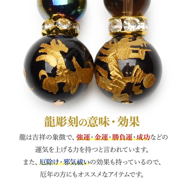 | 特徴・意味 | 龍神の彫刻が美しい8種類のひょうたん型のストラップをデザインいたしました! 古来よりひょうたんは神霊が宿るものとされ、そのくびれは吸い込んだ邪気を逃さない、末広がりの形は縁起の良いものとされ、魔除けや無業息災のお守りとして用いられてきました。 鈴なりに実る様子からは家運興隆や子孫繁栄の象徴にもされる縁起物です。 お守りやプレゼントにオススメのアイテムですのでぜひご検討ください。 【龍彫刻の意味・効果】 龍は吉祥の象徴で、強運・金運・勝負運・成功などの運気を上げる力を持つと言われています。 また、厄除け・邪気祓いの効果も持っているので、厄年の方にもオススメなアイテムです。 彫刻された龍は五本爪で、本来皇帝だけに使用することを許されていた特別な権威を持つ「最高品格の龍」です。 また、五爪龍は男龍であると言い伝えられており 強さや威厳などの象徴でもあります。 【水晶(クリスタルクォーツ)】 水晶は、すべてのものを浄化し、マイナスなエネルギーを取り払い、余分なものを排除してクリアな状態にしてくれる万能ストーンです。 また、潜在能力を引き出し、直感力、創造力を育み、生命力をアップしてくれるでしょう。 水晶には、雑念を取り去り、集中力を高める効果があるとされています。 【茶水晶(スモーキークォーツ)】 茶水晶は、古くから悪霊を追い払う力を持つと言われており、厄除け・魔除けのお守りとして使われてきました。 また、リラックス効果や癒やし・安眠効果があるとされ、ヒーリングストーンとしても高い人気があります。 【オニキス】 オニキスは魔除け・厄除けの力を持っており、悪意から身を守る「自己防衛の石」と呼ばれています。 また集中力や根気を養い、意志力や判断力を強化させてくれる為、仕事や人生の重要な局面での決断やスポーツ、試験などのお守りに適しています。 材質 ▼ 1.ピンク彫り水晶 青龍水晶ピンク彫り:14mm ローズクォーツ:10mm 銀ロンデル(ピンク):8mm 2.紫彫り水晶 青龍水晶紫彫り:14mm ラベンダーカルセドニー:10mm 平型 銀ロンデル(パープル):8mm 3.水色彫り水晶 青龍水晶水色彫り:14mm ブルーカルセドニー:10mm 銀ロンデル(ブルー):8mm 4.金彫り水晶 青龍水晶金彫り:14mm 水晶ゴールデンオーラ:10mm 金ロンデル(クリアー):8mm 5.素彫り水晶 青龍水晶素彫り:14mm オーラクラック水晶:10mm 銀ロンデル(ピンク):8mm 6.金彫り茶水晶 青龍茶水晶金彫り:14mm 茶水晶A:10mm 金ロンデル(クリアー):8mm 7.金彫りオニキス 青龍オニキス金彫り:14mm オニキス オーラ:10mm ロンデル(クリアー):8mm 8.銀彫りオニキス 青龍オニキス銀彫り:14mm オニキス オーラ:10mm 黒ロンデル(クリアー):8mm |