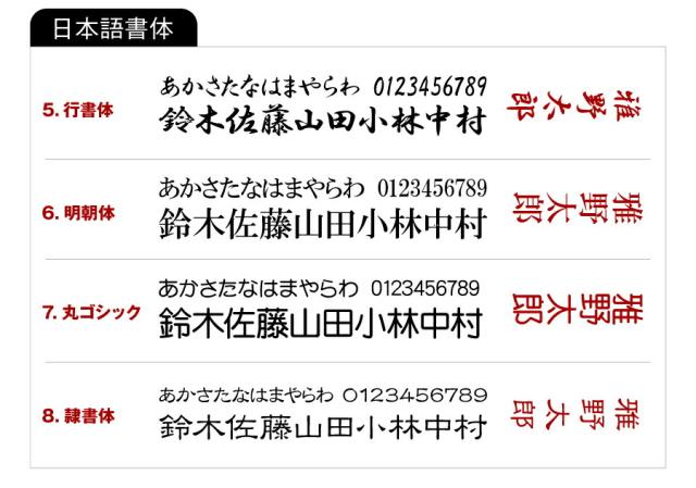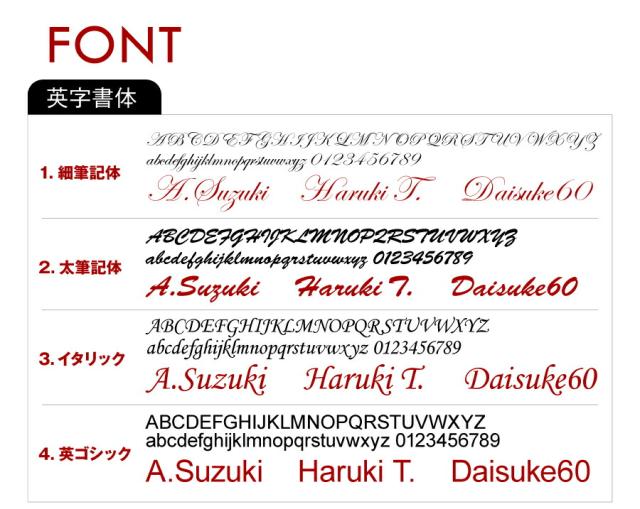 | 名入れ | お名前は注文画面の記入欄へご記入ください。 ■1.細筆記体・2.太筆記体は 全て大文字で記載の場合は、頭文字大文字+小文字になります。 ■メッセージ不可 ■2行不可 ■12文字程度まで ※上記以外の記入方法の場合は、当店で変更させていただくことがございます。 【日本語とローマ字 混合の彫刻内容】の場合は日本語書体に合わせて彫刻します。書体は日本語書体からお選びください。 |