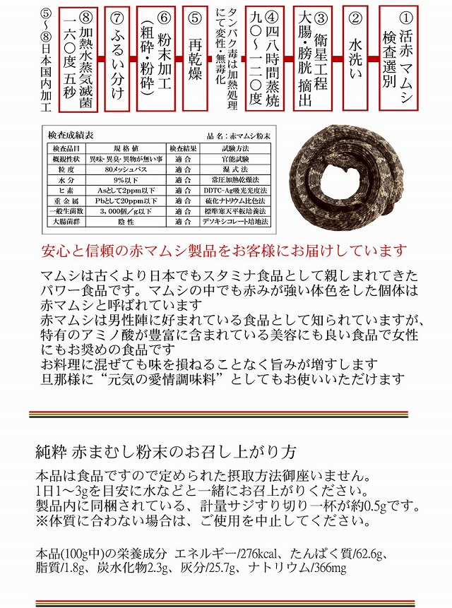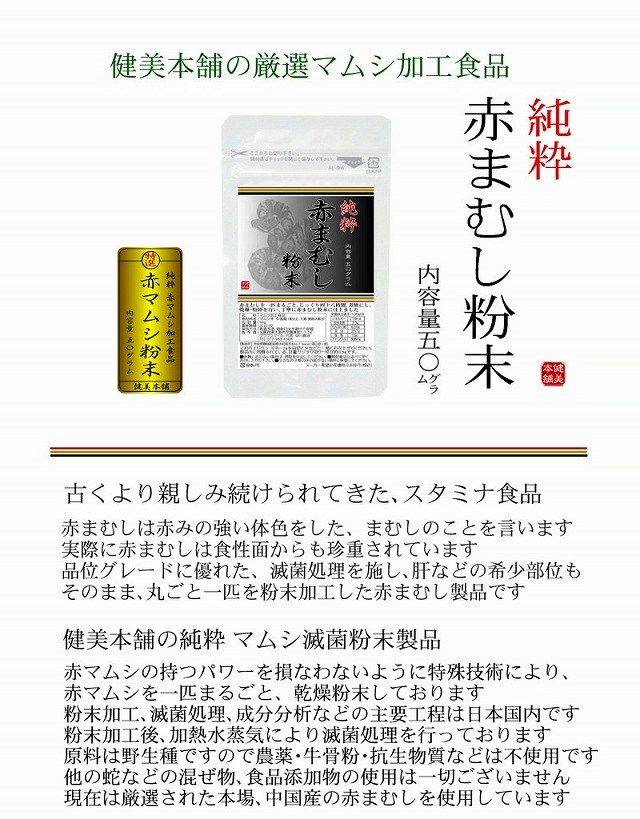 天然のマムシをじっくり48時間蒸焼を行い丁寧に純粋な粉末に仕上げました 古くより親しみ続けられてきた、スタミナ食品 赤まむしは赤みの強い体色をした、まむしのことを言います。実際に赤まむしは食性面からも珍重されています。品位グレードに優れた、滅菌処理を施し、肝などの希少部位もそのまま、丸ごと一匹を粉末加工した赤まむし製品です。 純粋 マムシ滅菌粉末製品 赤マムシの持つパワーを損なわないように特殊技術により、赤マムシを一匹まるごと、乾燥粉末しております。粉末加工、滅菌処理、成分分析などの主要工程は日本国内です。粉末加工後、加熱水蒸気により滅菌処理を行っております。原料は野生種ですので農薬・牛骨粉・抗生物質などは不使用です。他の蛇などの混ぜ物、食品添加物の使用は一切ございません。現在は厳選された本場、中国産の赤まむしを使用しています。 安心と信頼の赤マムシ製品をお客様にお届けしています。 マムシは古くより日本でもスタミナ食品として親しまれてきたパワー食品です。マムシの中でも赤みが強い体色をした個体は赤マムシと呼ばれています。赤マムシは男性陣に好まれている食品として知られていますが特有のアミノ酸が豊富に含まれている美容にも良い食品で女性にもお奨めの食品です。 お料理に混ぜても味を損ねることなく旨みが増すします。旦那様に“元気の愛情調味料”としてもお使いいただけます。 |