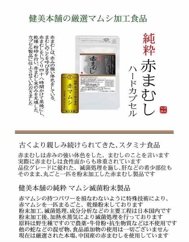 天然のマムシをじっくり48時間蒸焼を行い丁寧に純粋な粉末に仕上げました 古くより親しみ続けられてきた、スタミナ食品 赤まむしは赤みの強い体色をした、まむしのことを言います。実際に赤まむしは食性面からも珍重されています。品位グレードに優れた、滅菌処理を施し、希少部位もそのまま、丸ごと一匹を粉末加工した赤まむし製品です。 健美本舗の純粋 マムシ滅菌粉末製品 赤マムシの持つパワーを損なわないように特殊技術により、赤マムシを一匹まるごと、乾燥粉末しております。粉末加工、滅菌処理、成分分析などの主要工程は日本国内です。粉末加工後、加熱水蒸気により滅菌処理を行っております。原料は野生種ですので農薬・牛骨粉・抗生物質などは不使用です。他の蛇などの混ぜ物、食品添加物の使用は一切ございません。現在は厳選された本場、中国産の赤まむしを使用しています。 安心と信頼の赤マムシ製品をお客様にお届けしています。 マムシは古くより日本でもスタミナ食品として親しまれてきたパワー食品です。マムシの中でも赤みが強い体色をした個体は赤マムシと呼ばれています。赤マムシは男性陣に好まれている食品として知られていますが、特有のアミノ酸が豊富に含まれている美容にも良い食品で女性にもお奨めの食品です。 本品は赤まむし粉末のみを充填したハードカプセル製品です。 |