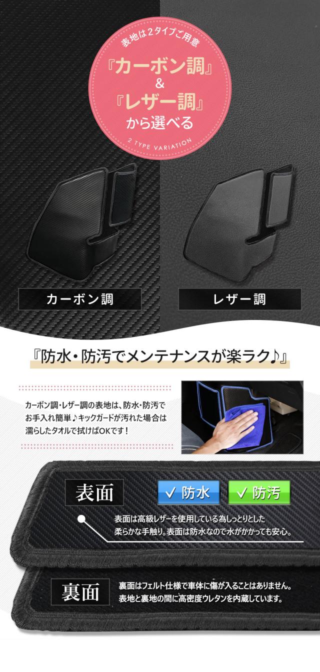 乗降時に足が当たって傷ついたり、お子様が靴で蹴って傷がついたりしてしまう車内の内張り・足元をしっかり保護してくれるキックガードシリーズ! 新車時のようなきれいな状態を保ちたい!こんな方におすすめです。 オーバーロックの色を選べるので、車内を華やかにコーディネートすることも可能です♪ ■専用設計だからぴったりフィット! 専用設計のカバーだから傷つきやすい部分をしっかりカバー! マジックテープで貼るだけの簡単取付で効果絶大。 ■表面の生地は2つのタイプから選べます 表面は、カーボン調・レザー調の2つのタイプからどちらかを選べます。 高級レザーを使用しているため、しっとりとした柔らかな手触り。 また、表面は防水仕様で水で汚れても染み込みません! 汚れた場合は固く絞った濡れタオルなどでサッと拭くだけでOK! ■裏面は高級フェルト仕様 裏面はフェルト仕様でめったなことでは車体に傷が入ることはありません。 表地と裏地の間に高密度ウレタンをラミネートしています。 ■信頼の日本製 本製品は日本国内生産の安心品質。 国内の提携工場にて熟練の職人が手作業で製作しています。 安価な商品にはない仕上がりをお届けいたします。 ハイクオリティな日本製品をぜひご体感ください! |