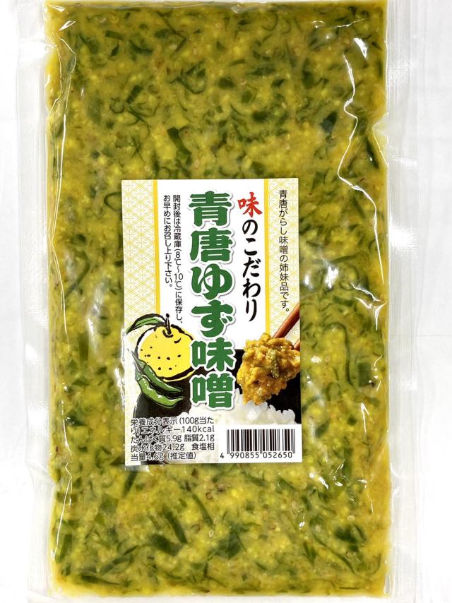 | 原材料/商品内容 | 味噌、青唐辛子、砂糖、柚子ペースト、もろみ、ごま、鰹だし、食塩、寒天/調味料(アミノ酸等)、ソルビット、酸味料、甘味料(ステビア)、香料、グァーガム、酸化防止剤(V.C)、着色料( (黄4、銅葉緑素)、(一部に小麦・大豆・ごま・ゼラチンを含む) |