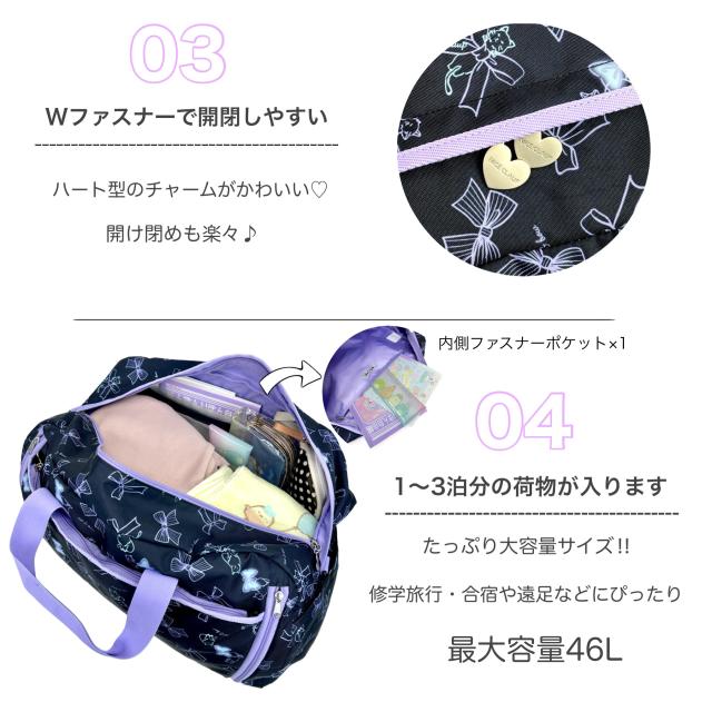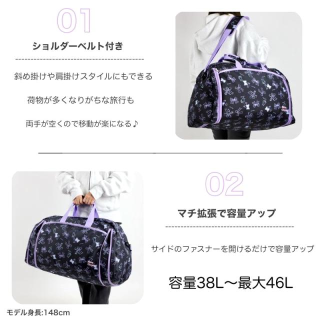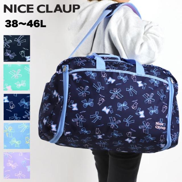 【商品レビュー記入で+5%】ナイスクラップ ボストンバッグ NICE CLAUP 拡張 拡張タイプ 拡張型 ショルダーベルト付き 子ども 子供 女の子 女子 旅行用 トラベル 修学旅行 林間学校 38〜46L 1泊 2泊 3泊 NC390 かわいい 学校行事 学校 猫 ねこネコ リボン 女児 大容量