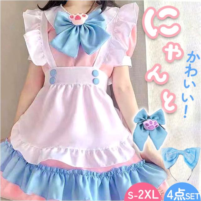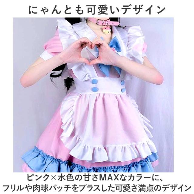 メイド服 ピンク 通販 コスプレ 衣装 女性 ワンピース ドレス 猫 ネコ メイド 半袖 ミニスカート リボン アクセサリー付き エプロン 肉球 フリル 膝丈 喫茶 漫画 ガーリー ロリータ