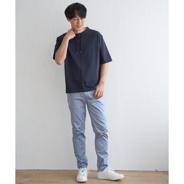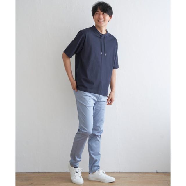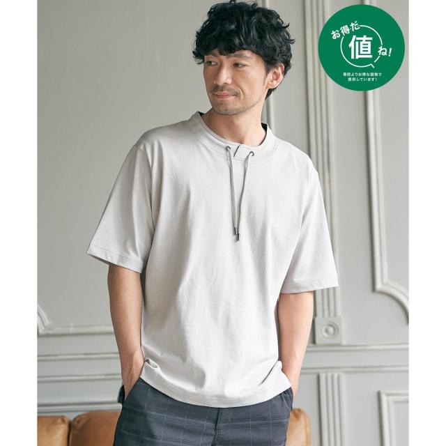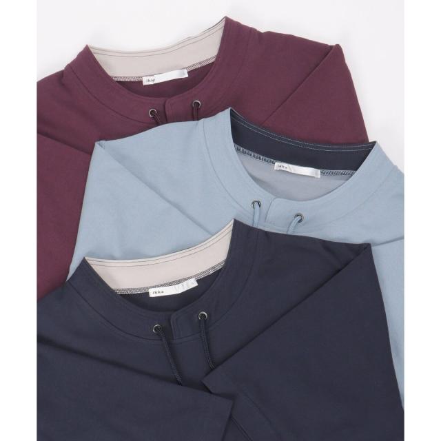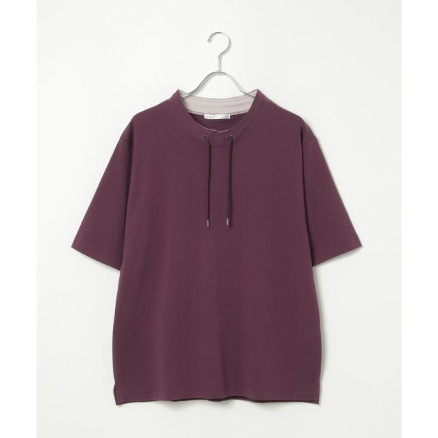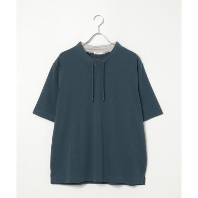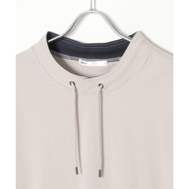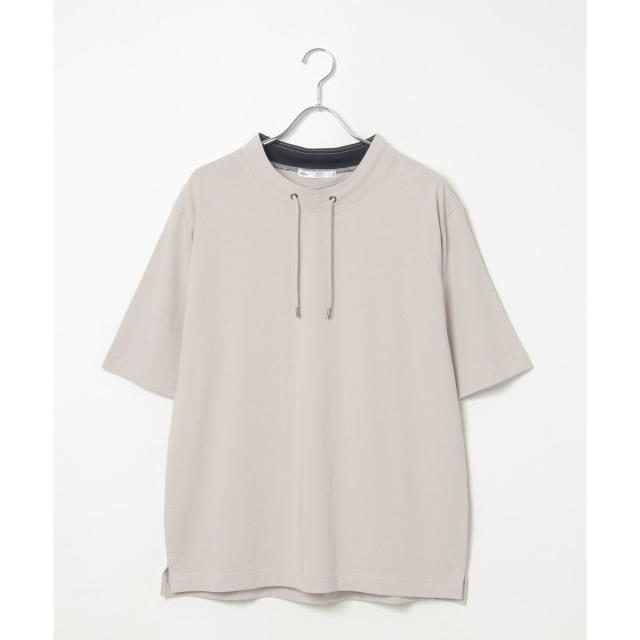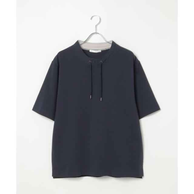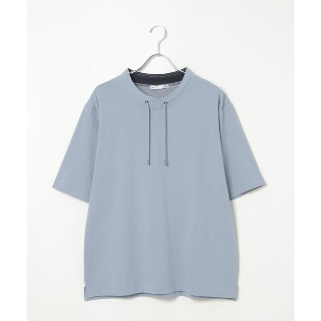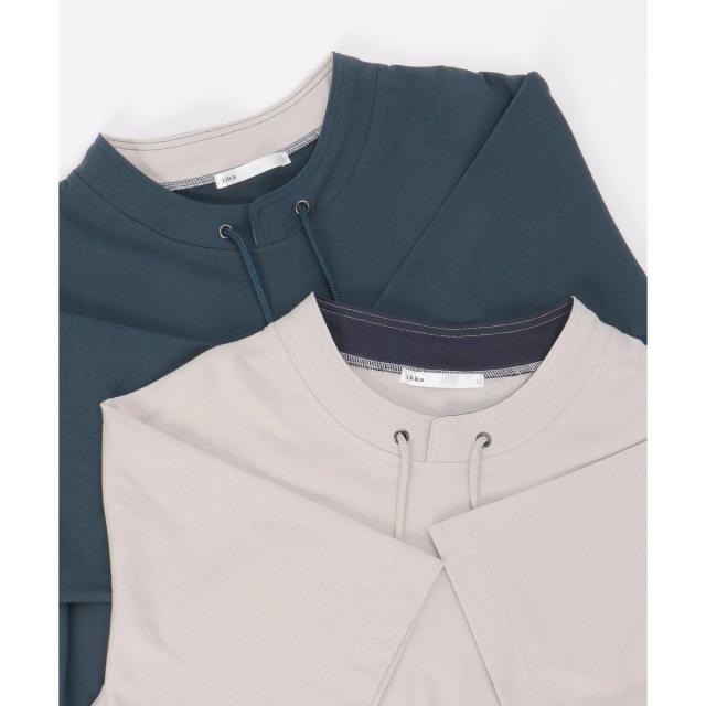 ルーイカラーと呼ばれる、スタンド襟にスピンドル(紐)を通した首回りのデザインが特徴的な5分袖Tシャツ。