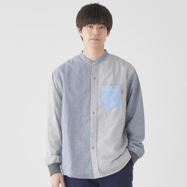 無地やストライプ、ギンガムチェックなど複数のシャツ素材を用いて切り替えたユニークな表情がポイント。
