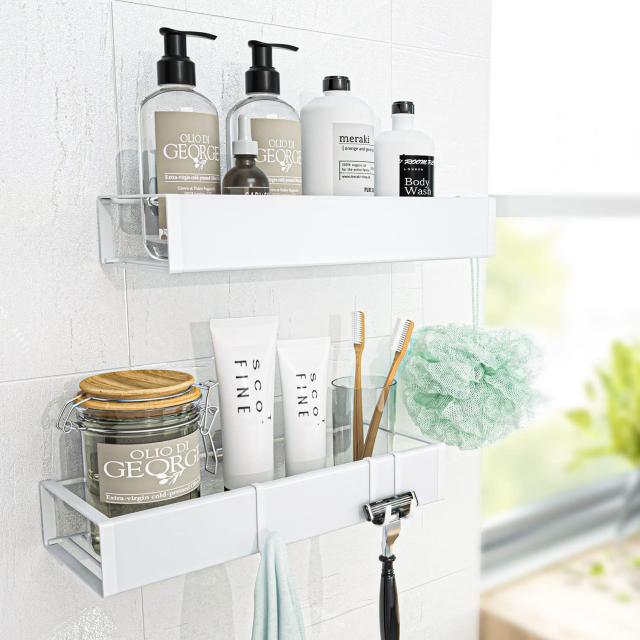 ?【多用途使用、収納力抜群】2段式でたっぷり収納、多機能ラックです。間隔は自由に調整して、収納スペースを有効活用して節約できます。この収納ラックは浴室だけではなく、洗面所、キッチン、バルコニー、リビングルームでもご利用いただけます。様々な場所で便利に使用できます!ボディソープ、シャンプー、洗顔料、歯磨きコップや石鹸などのお風呂グッズ、調味料や化粧品などをスッキリ収納できます。収納ラックには4つの取り外し可能なフックが付き、シェーバー、タオル、ボディスポンジや小さな調理器具などを掛けることができます。