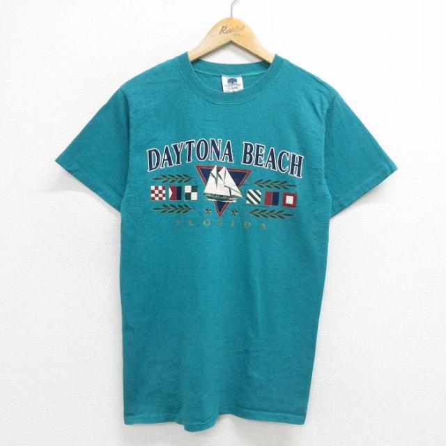 古着 半袖 ビンテージ Tシャツ メンズ 90年代 90s デイトナビーチ 船 コットン クルーネック USA製 青緑他 ボーダー Mサイズ 中古 古着