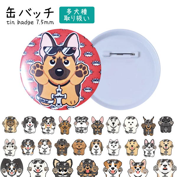 缶バッチ 犬 75mm 小型犬 中型犬 大型犬 トイプードル チワワ ダックスフンド シーズー パグ パピヨン フレンチブルドッグ 柴犬 コーギー シェルティ シェパード ゴールデンレトリーバー ドーベルマン