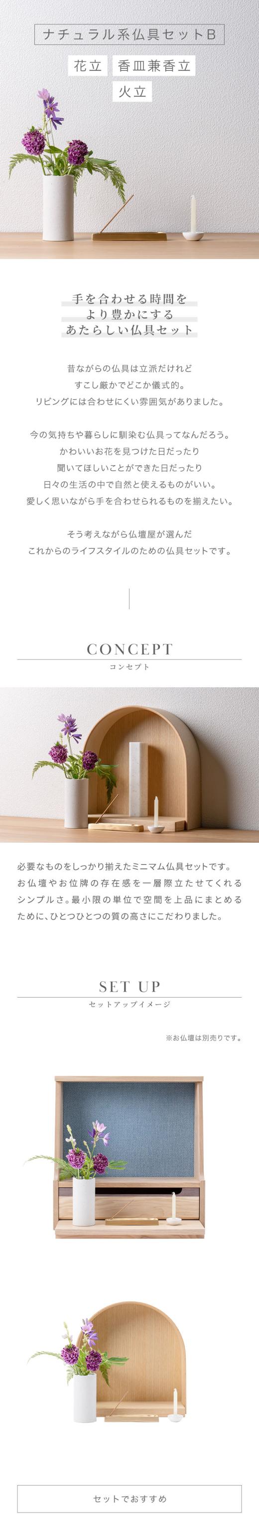 ミニ 仏具セット 「ナチュラル系仏具セットB」 おしゃれ モダン 三具足 3点セット 花立 香立 香皿 香炉 火立 ろうそく立て ミニ仏具 ミニ仏壇 小物 白 真鍮 手元供養