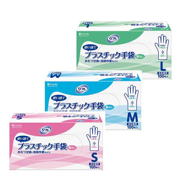 リフレ プラスチック手袋 粉なし 90376 90377 90378 100枚入 リブドゥコーポレーション 使い捨て ビニール グローブ 介護用品
