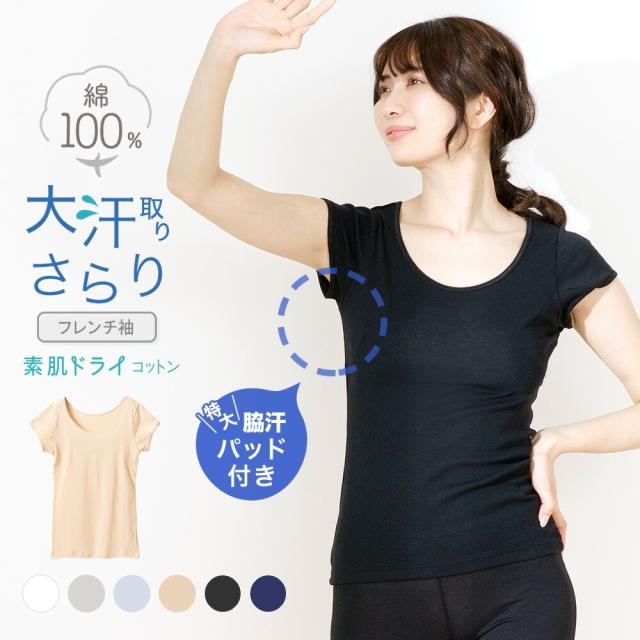 送料無料 綿100% 大汗取り 脇汗 インナー フレンチ袖 インナーシャツ レディース 半袖 汗取り パッド付き 素肌ドライ 春夏 汗染み 防止 汗 対策 半袖 シャツ 綿 汗とり パット付き 吸汗速乾 M9492P-E