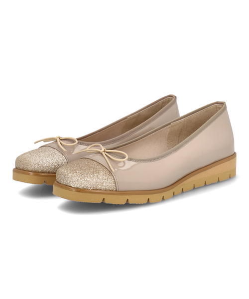 定番的バレエシューズデザインに低めのウェッジソールを組み合わせ、程よいボリューム感を持たせたバレエパンプス。