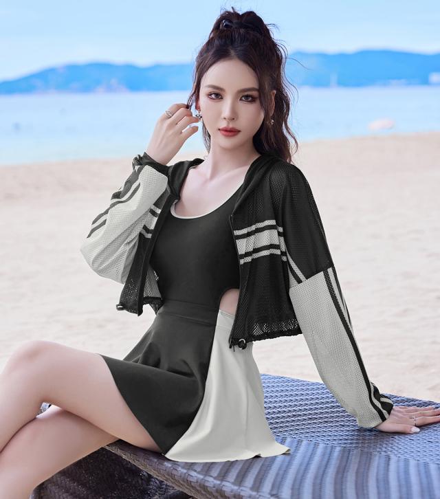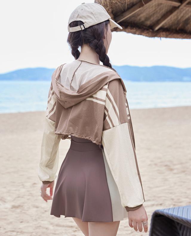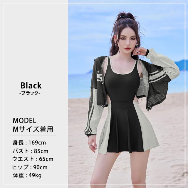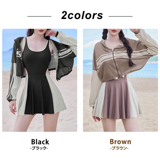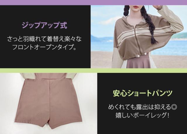 冬新作 フィットネス水着 レディース 体型カバー ワンピース オールインワン クロップド丈 パーカー 長袖 メッシュ トップス 2点セット ドローコード 裾 フレア サイドカットアウト ノンワイヤー パッド付き バスト 盛れる 二の腕