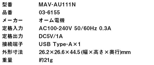 ■MAV-AU111N(03-6155) DC5V/1.0A USB-ACアダプター