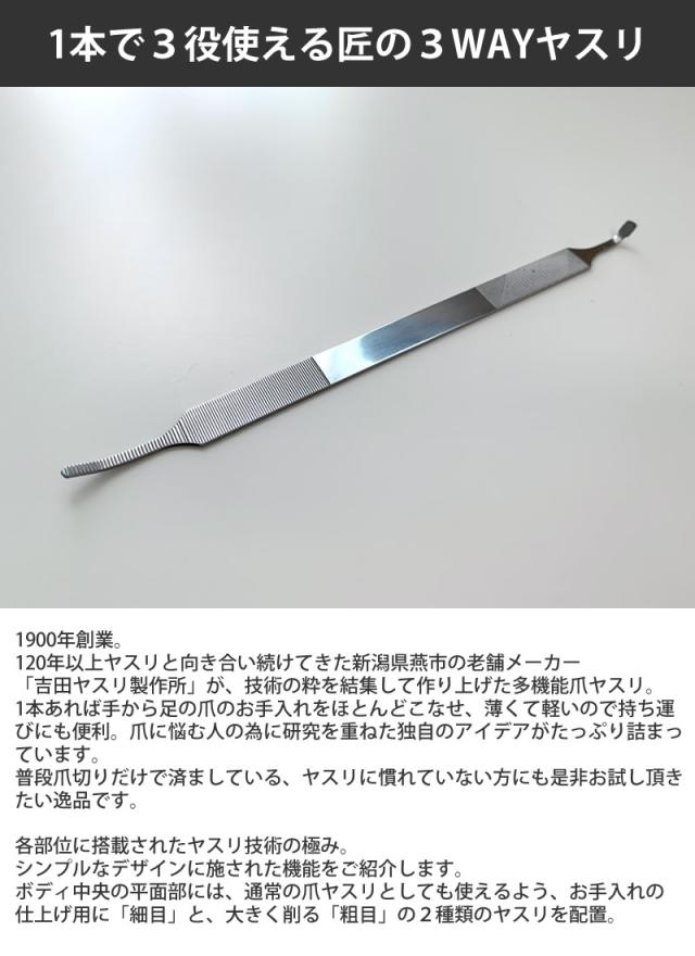 吉田ヤスリ 1本で3役使える匠の3WAYヤスリ+ポケットヤスリ付きセット (メール便送料無料) 爪ヤスリ 巻き爪 巻き爪用ヤスリ 爪垢取り ネイル 仕上げ 細目 粗目 手入れ YOSHIDA YASURI 燕市 便利 グッズ